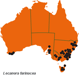 | Lecanora farinacea occurs on open or somewhat shaded, siliceous rocks in southern Australia (W.A., S.A., N.S.W., A.C.T., Vic. and Tas.). Also in southern Africa, Central and South America and New Zealand. | ||