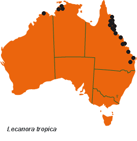 Occurs on bark in mangroves, rainforest margins and gallery forest in W.A., N.T. and Qld. A pantropical species.