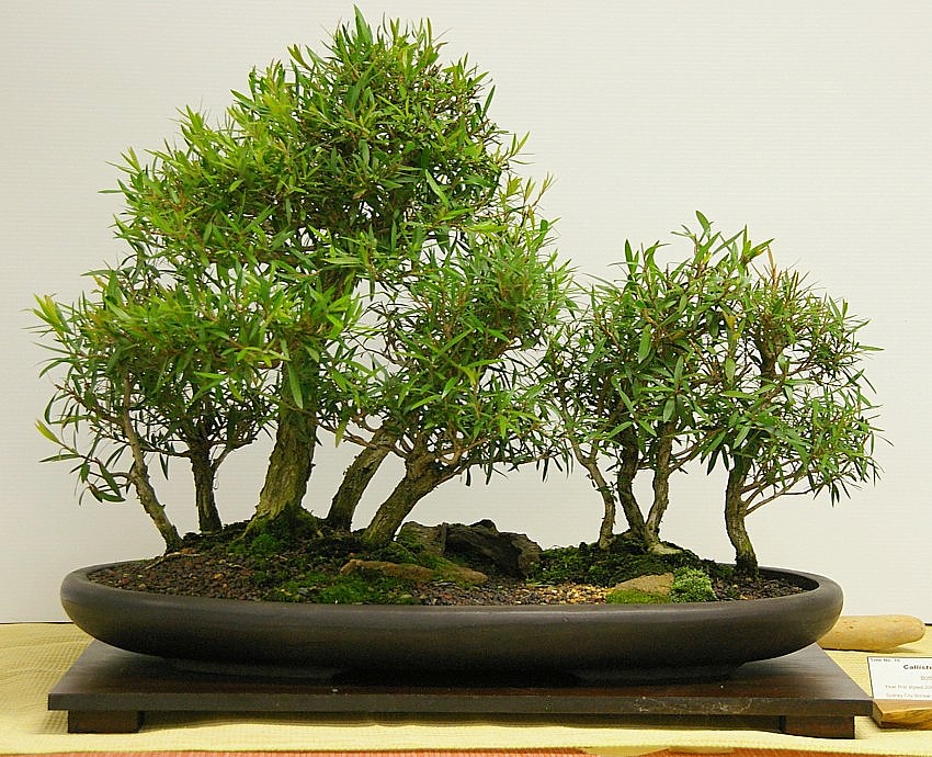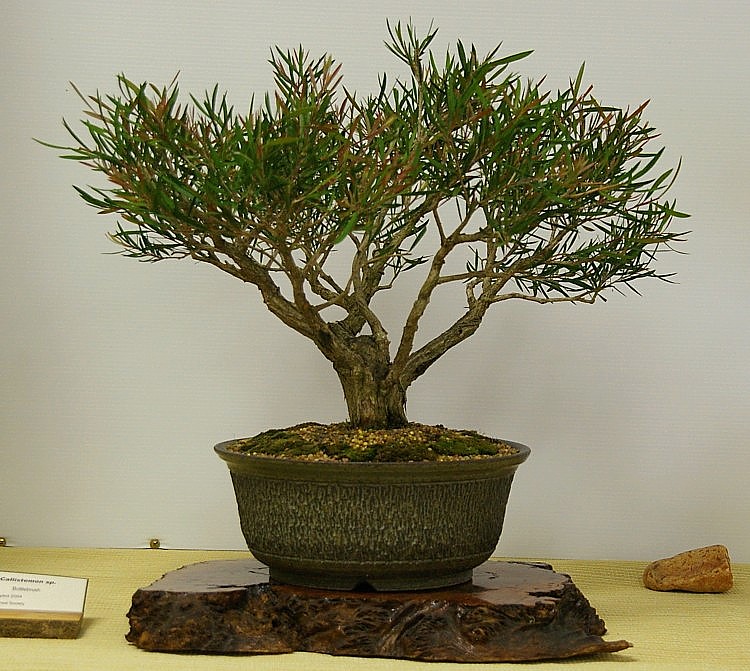 Callistemon The tree was a bonsai-nursery stock plant with two trunks. One trunk was reduced to improve the tree's balance and it was grown-on to develop branches and foliage pads. It was repotted from the training pot to a bonsai pot in September 2008 which revealed an interesting and well-developed nebari. It grew one flower this spring and will be encouraged to produce more next year. |