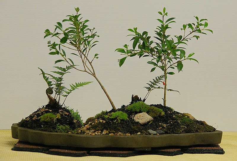 Acmena smithii and Dicksonia antarctica I have only recently transferred these plants into the landscape tray, adapting the penjing "Landscape and Water" styling. As the Lilly Pilly and Dicksonia are native to the moist coastal gullies and rainforests of Qld, NSW and Victoria (plus SA and Tasmania for the Dicksonia) I have attempted to create this atmosphere in the landscape. Lilly Pillys produce edible fruit - which hopefully will emerge from the buds on these plants. The Dicksonia, even at this very young stage, has the soft brown hairs at the base of the fronds. |