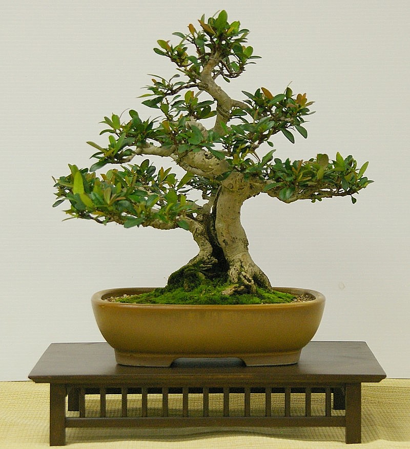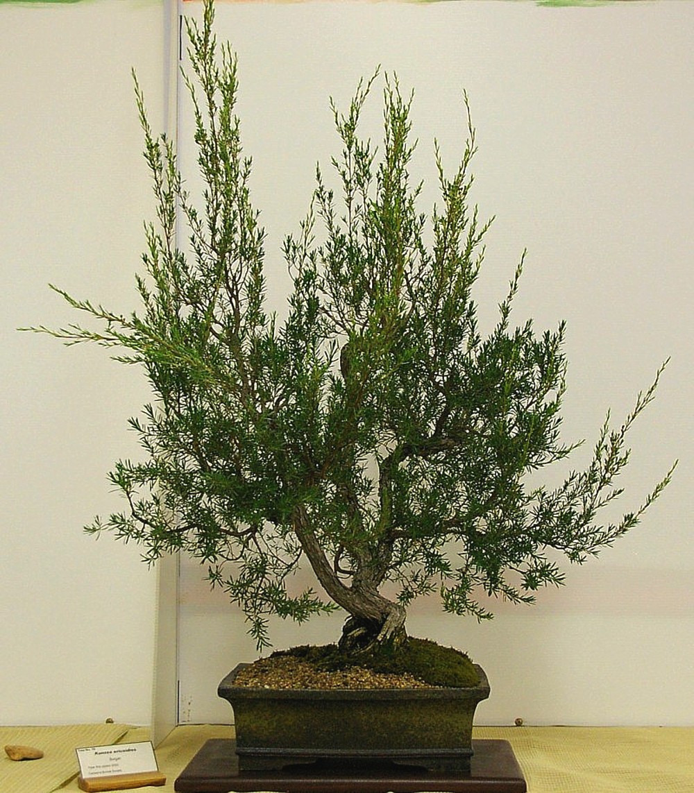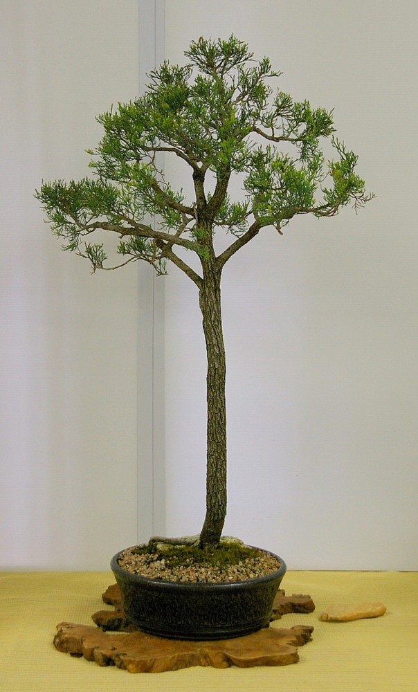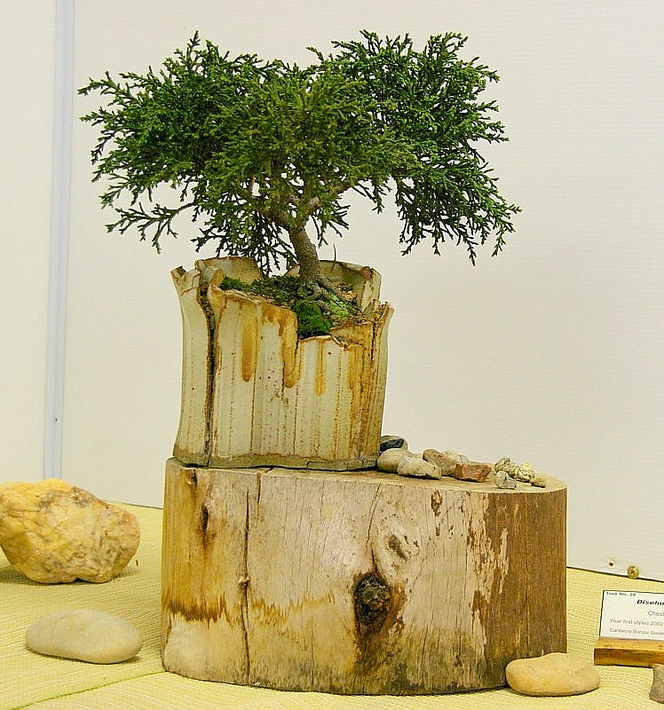 A South African demonstrator, Louis Nel, styled this tree at the AABC National Bonsai Convention in 2004. It is modelled on the flat top acacias that grow in the warmer parts of Africa. The tree was part of the Belconnen Mall plantings in 1976 and was 'rescued' in 2002 when the large planter boxes at Westfield Belconnen were being replaced.