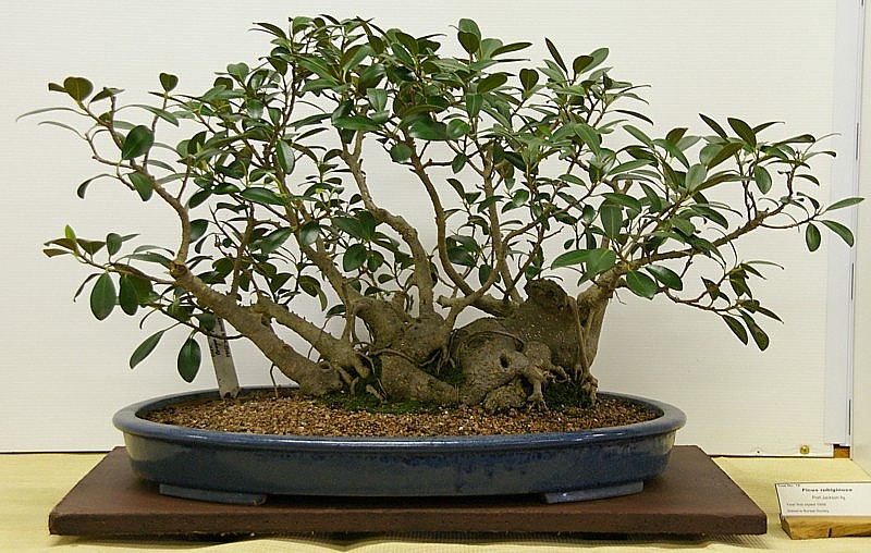 Ficus rubiginosa The tree was bought as tube stock and has always been grown as a bonsai and always in a bonsai pot. Port Jackson figs develop a thick base if grown in a bonsai pot and the rest of the tree is a result of judicious trimming, wiring and shaping over the life of the bonsai. If the figs are well fertilized and healthy they can be defoliated at least once a year and this gives good ramification to the branches and also gives us small leaves. |