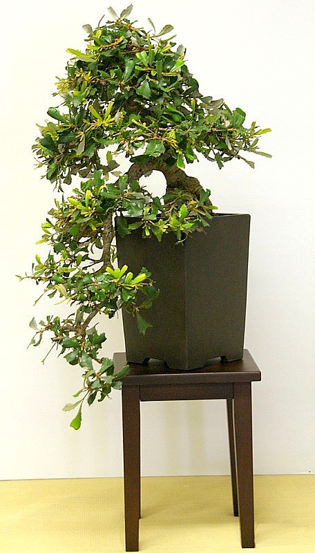 Banksia integrifolia After being inspired by B. integrifolia in the 2002 show, I went looking for some material I could work with. I picked up this Banksia at the Queanbeyan Council Nursery as nursery stock in early 2003. Most of the basic shaping was achieved by the cut and grow method. It was potted into a bonsai pot in 2004. Since then it has undergone some structural changes and been placed into a Pat Kennedy pot. |
