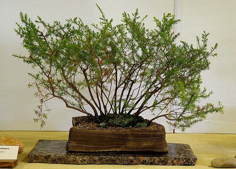 Kunzea ambigua A forest grouping, such as you might find near a stream. The canopy is thin, reflecting the drought of the past several years. The twisting branches tell of survival in a sometimes harsh landscape. This miniature forest comes from self-sown seeds from another K. ambigua that has since died from an unexpected drought-event. The setting has a distinctly Australian bush feeling. The pot. created by R. Hnatiuk, helps to evoke the harsh but still beautiful, bush environment. |