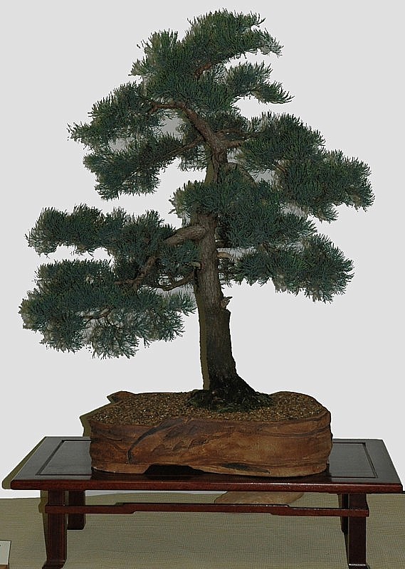 Callitris glaucophylla This tree was collected near Wagga Wagga, NSW, in 1999. Along with other small trees collected, the tree was grown-on in a large pot. Continual pinching back of new growth has kept the foliage to a rounded shape. In 2004 the tree was planted into a bonsai pot (created by Pat Kennedy) and the lower branches were wired to give width to the canopy. More wiring was done in 2007, the lower branches to give more width and the higher branches to give a very old look to the tree.