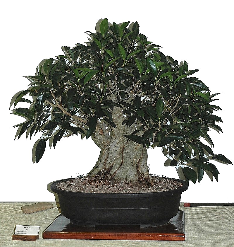 Ficus sp. This tree was grown from seed collected in Ashfield Park in Sydney. It was grown for use as a bonsai because, as a full grown tree it would be too big for most backyards. I am not sure of the species but it is not a Moreton Bay or Port Jackson fig; perhaps it is a hybrid. This fig develops a large base with strong roots and aerial roots. It likes a warm sunny spot along with good drainage, as it is susceptible to root rot in poorly drained soil. Figs thrive on a regime of regular fertilising, watering and pruning. Native figs do not like the cold and growth is very slow in Canberra compared to, say, Brisbane. Figs offer great potential as bonsai, being long lived, easy to train and very rewarding as bonsai. |