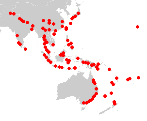 The red dots on the accompanying map show the distribution of the moss Thuidium cymbifolium. It is a good example of a species with a distribution that extends from Australia well into Asia (as well as to various Pacific islands, including Hawai'i). Pyrrhobryum bifarium and Rhizogonium distichum, two other mosses, are found in Tasmania, parts of south-east mainland Australia as well as New Zealand and South-East Asia. Pyrrhobryum latifolium is found in eastern Queensland, roughly between Maryborough and Cooktown, throughout Malesia and also in Japan. Pogonatum neesii is found on the eastern Australian mainland, from western Victoria to north Queensland, the western Pacific, Japan, Taiwan through much of Malesia and South-east Asia to the northwest extremity of Yunnan Province in China