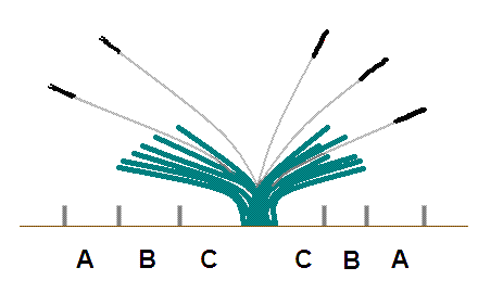 Case StudiesGrass tussocks in arid SpainThe south-east of Spain is said to be the most arid part of Europe. Rainfall is low and summer temperatures may reach 50° Celsius for extended periods in some areas. In this region bryophytes (and lichens) exploit the protection offered by the larger grass tussocks, mostly Stipa tenacissima and Lygeum spartum. A group of Spanish researchers investigated the bryophyte and lichen communities growing with grass tussocks on gypsum-bearing soils in south-east Spain. These tussocks provide protection against direct sunlight and around their bases soil moisture will be held for longer since evaporation would be slower in the shade of the tussock. The area surrounding each tussock is not uniform and the research team distinguished three micro-habitat zones around each tussock. The following stylized diagram represents one tussock, with grey-green leaves and several flower spikes shown in grey and black.