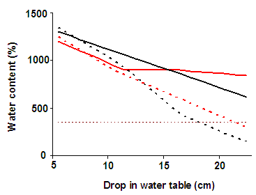Case StudiesSphagnum and the water tableIn a Sphagnum wetland the capitula that are exposed to the air may lose water through evaporation. The capitula need water for photosynthesis and this may come from rain or from the water body below. Water from below moves up via capillary action since Sphagnum lacks internal water-conducting tissue. The species of Sphagnum vary in their ability to convey water by capillary action. The vertical axis in the following graph shows the water content in the capitula of four Northern Hemisphere Sphagnum species as the water table is experimentally lowered from 5 to 22 centimetres below the Sphagnum surface. The four species are Sphagnum fuscum (solid red line), Sphagnum rubellum (solid black line), Sphagnum balticum (broken red line) and Sphagnum tenellum (broken black line). The horizontal, dotted line shows the approximate water content needed for Sphagnum to maintain 50% of the maximum photosynthetic rate.