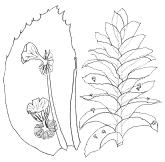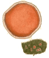 Many of the fungi that grow on bryophytes have quite small fruiting bodies (often under half a millimetre in size) and such fungi need at least a low power microscope to be seen – clearly good examples of microfungi. Many of those bryophilous microfungi are asexual spore producing forms and the following drawings show two examples. The drawings are taken from the publication given in the following reference button and are reproduced by permission of the Muséum national d'Histoire naturelle in Paris. On the left is the fungus Botrytis cinerea. The elongated dark grey object is a sclerotium within a stem of the moss Polytrichum juniperinum. From the sclerotium there are short hyphal outgrowths with clusters of asexual spores at their tips. The moss stem is 1-2 millimetres wide. On the right are brownish hyphae and the knobbly asexual spores of Epicoccum plagiochilae on a leaf of a liverwort in the genus Plagiochila. The drawing shows part of a cross section of the liverwort leaf and you can see several large leaf cells. The leaf is about a twentieth of a millimetre thick