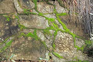 In the cases illustrated above there are very clear differences – between the rocky surfaces and the soil or between the litter-strewn forest floor and the solid woody protuberance on which the Hypnum is growing. The photo (right) shows part of a rock wall in the Australian National Botanic Gardens in Canberra. You can see a good growth of moss, but that growth is in lines, rather than as spread-out colonies over the rock surface. Incidentally, the green of the moss may look fairly uniform but there are three species, in three different genera, growing here: Gemmabryum dichotomum, Grimmia laevigata and Tortula muralis. You can see the same phenomenon on many brick walls, mosses growing in lines – along the mortar joins. Why are these mosses growing in lines?