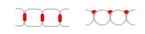 shows the surface view of part of a Sphagnum leaf. In the closer view (right) you can see both a few empty cells as well as a number of green, chlorophyllous cells. The empty cells readily take up water but a lot of water is also held between the overlapping leaves. There is some variation in the placement of the chlorophyllous cells, depending on species, and the following diagrams are stylized depictions of two of the arrangements. The diagrams show cross-sections, with the large grey cells being the empty cells and the red areas marking the locations of the chlorophyllous cells. The insides of the empty cells are connected to the outside world by tiny pores.