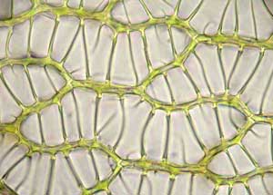Living Sphagnum plants have an impressive water holding potential, with a number of species able to hold 20 or more times their own weight in water. Sphagnum owes its great water-holding capacity to a combination of leaf structure and growth habit. The major part of a Sphagnum leaf is composed of empty, dead cells, with the chlorophyllous cells occupying just a small volume. This photo