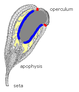 At the bottom of the diagram you can see part of the seta. In the basal half of the capsule itself is the apophysis, also referred to as the hypophysis, and in Funaria hygrometrica