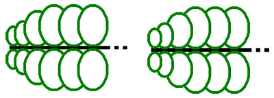There is variation in the way leaves are arranged on the stem. In many leafy species the lateral leaves meet the stems at an oblique angle, with the leading edge (i.e. the one nearer the stem tip) of one leaf overlapping the trailing edge of the next leaf in the row. There are two ways in which this overlapping can occur, as shown by the following diagrams. In each the view is of the dorsal side and the tip of the stem is towards the left of the screen. In the diagram on the left you can easily see the leading edge of each leaf, while in the diagram on the right you can easily see the trailing edge of each leaf. Technically those leaf arrangements are referred to as incubous and succubous, respectively.
