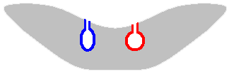 The species of Riccia vary in size and internal structure. The air chambers and photosynthesizing cells are in the upper half of the thallus, with food-storage cells in the lower half. The upper surfaces of Riccia thalli may be convex or concave, depending on species, and in the latter case the thalli are often somewhat V-shaped in cross-section. The stylized cross-section above shows where the archegonial and antheridial chambers are to be found in some of the Riccia species. An archegonial chamber is shown in red, an antheridial chamber in blue and, in each case, you can see the necks that lead from the chambers to the thallus surface. These necks are necessary to allow the sperm from an antheridium to get out and also for the sperm to be able to reach the eggs contained within the archegonia. The antheridial and archegonial necks typically protrude a little above the thallus surface. Once an egg in the archegonium has been fertilized a spore capsule will form within the thallus. Typically, when the spores are mature, the upper surface of the capsule and the nearby thallus cells disintegrate to create a hole and so expose the spores. In this photograph