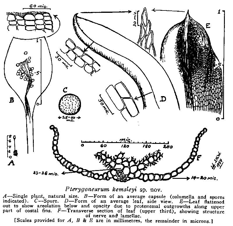 Pterygoneurum kemsleyi - drawings by Jim Willis who published this as a new moss species in the Victorian Naturalist of May 1954. Later research has concluded that this species is identical to Pterygoneurum macleanum, already published in 1916.