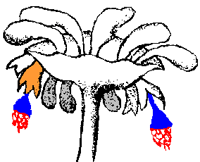 Note that in the last of the three examples just illustrated, the complex umbrella-like structure is part of the Marchantia gametophyte. What that means is that the stem holding up an umbrella is not a seta – since the umbrella stem is haploid gametophyte tissue, whereas a seta develops from a fertilized egg and is diploid. Technically the umbrella-like structure is called an archegoniophore and the diagram on the left shows the structure. Several spore capsules are produced underneath each umbrella and the capsules hang downward, each held in place by a short seta. Two mature sporophytes, with open spore capsules are shown in blue, with the seta of the sporophyte on the right being visible. Red represents the exposed spores and ELATERS of each sporophyte. An immature sporophyte is enclosed within a protective sheath, which ruptures as the expanding sporophyte reached maturity. One of the ruptured sheaves is shown in orange and some unruptured sheaves are shown in grey. The diagram has been copied from G Hahn's Die Lebermoose Deutschlands, published in 1885.