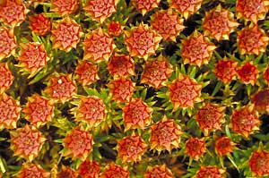In some other bryophytes there may be a little bit more complexity to sperm dispersal. The photo (right) shows a colony of the moss Polytrichum juniperinum . It is a tufted moss that grows on soil and this photo was taken from above, looking straight down on the colony. The red-rosettes at the tops of the stems are composed of pigmented leaves, with the other leaves on each stem being green. The leaves that make up the red rosettes are very stiff and so form a fairly robust, cup-like structure, often about 5mm in diameter. The antheridia occur within that whorl of leaves and discharge the sperm-mass into the water-filled, reddish cup. From there raindrops can splash the sperm cells further away. Fats within the sperm masses have ensured that the masses have broken up, so making it easier for a falling drop to dislodge some of the sperm cells. The same splash-cup mechanism is used by various other species related to Polytrichum juniperinum , though the splash cups are not so strikingly coloured. These mosses belong to the family Polytrichaceae. In some members of the family, the splash-cup mechanism may carry the sperm up to 1.5 to 2 metres away, though most splashes will land much closer. Similar antheridial-containing rosettes are found in various other mosses as well and there's more in the SPLASH CUP SECTION.