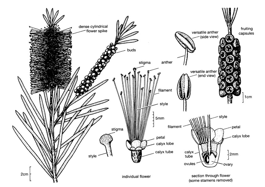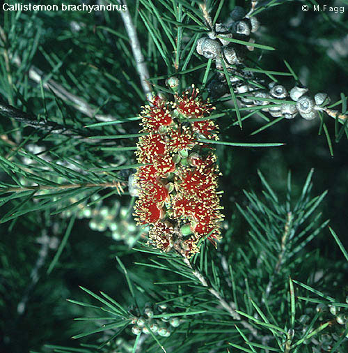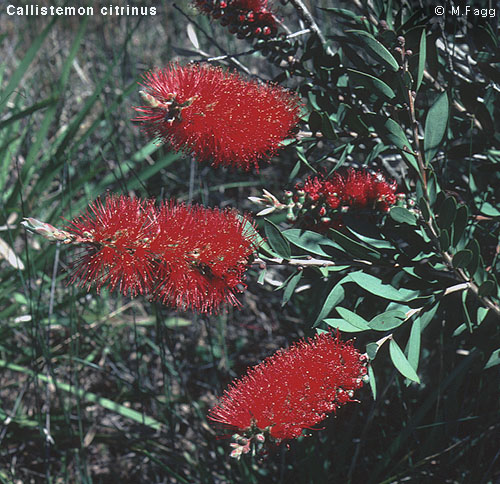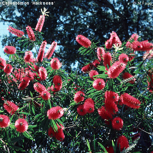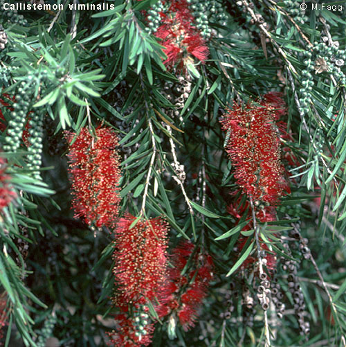 This large bottlebrush is widely cultivated. Plants produce bright red flower