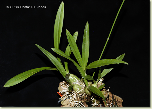 Epiphytic or lithophytic herb forming dense clumps. Roots much branched, aerial, thin, white, lacing over and covering pseudobulbs. Pseudobulbs crowded, ovoid, 3-7 cm x 3-4 cm, pale green, shiny, and covered in white, scarious sheaths when young. Leaves 2-4, erect, apical, sessile, bases sheathing stem; lamina narrowly ovate to narrowly elliptical, 15-20 cm x 2-2.5 cm, dark green, leathery. Inflorescence an axillary panicle, arching, 200-600 mm long, from base of pseudobulb, thin, wiry; pedicels 4-5 mm long. Flowers numerous, resupinate, porrect, 4-5 mm wide, cream, yellowish or pinkish with white labellum. Dorsal sepal erect, linear to oblong, 4-5 mm x 1 mm, yellowish-green, distal margins incurved, apex incurved. Lateral sepals fused along inner margins forming a synsepalum, cymbiform, 4-5 mm x 1.5 mm, projecting beneath the labellum, yellowish-green. Petals spreading widely, linear-obovate, 4-5 mm x 1 mm, apex obtuse, yellowish-green, becoming white at the margins. Labellum fused to column, porrect to obliquely deflexed, 4-5 mm x 4 mm; 3-lobed; lateral lobes, broadly triangular and spreading, midlobe short with 2 prominent calli. Column porrect, 3.5-4 mm long; with narrow cylindrical arms, 1.5 mm long; column wings forming mitra over anther. Column foot absent. Capsules ovoid to ellipsoid, 6-8 mm x 4-5 mm, dehiscent.