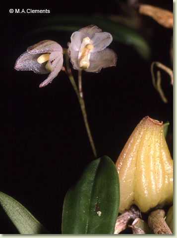 Epiphytic or lithophytic herb forming dense spreading clumps. Rhizome creeping, appressed to host, much branched, 1 mm thick. Pseudobulbs well-spaced, erect, ovoid or conical, 8-15 mm x 8-12 mm, light green, grooved or ribbed. Leaf solitary on pseudobulb, erect, apical, sessile or shortly petiolate; lamina narrowly oblong, narrowly ovate or narrowly obovate, 4-7 cm x 0.8-1.2 cm, dark green, stiff. Inflorescence an axillary raceme, 50-90 mm long, from base of pseudobulb, filiform. Flowers 1-8, resupinate, porrect to nodding, campanulate, 4-6 mm x 4-5 mm, white, cream or greenish, rarely pink. Sepals and petals not widely spreading. Dorsal sepal porrect, hooded, ovate, 5-7 mm x 2.5-3 mm. Lateral sepals broadly triangular, falcate, 5-7 mm x 3-4 mm, bases fused to column foot. Petals smaller than sepals, oblong, 3-3.5 mm x 1.5 mm, apex obtuse or apiculate. Labellum narrow, 5 mm x 1.5 mm, curved, fleshy, base and margins sparsely hairy, yellow. Column porrect, 1.5 mm long. Column foot at right-angles to column, 3 mm long. Capsules erect, dehiscent.