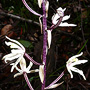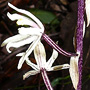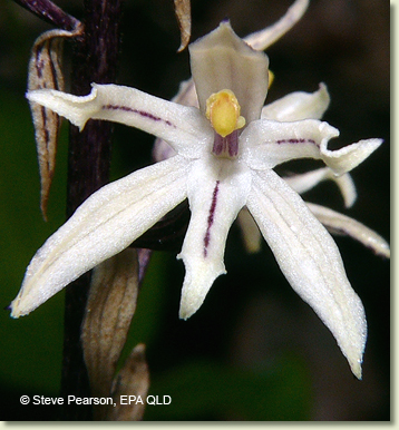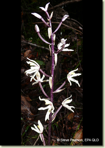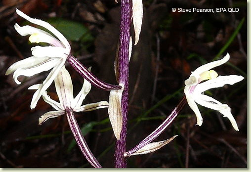 Terrestrial leafless herb. Leaves absent. Inflorescence a terminal raceme, erect, 300-550 mm long, deep purple, shiny, fleshy, brittle; pedicels 2-3 mm long. Flowers 4-20, resupinate, erect to porrect, 10-12 mm x 10-12 mm, white with purple stripes and markings. Sepals and petals similar in size, not opening widely. Dorsal sepal curved forwards, hooded, ovate, 10-12 mm x 3 mm, apex acute to acuminate. Lateral sepals free, obliquely deflexed, divergent, 10-12 mm x 3 mm, apex acuminate. Petals obliquely erect, 10-12 mm x 2 mm, apex acuminate, often twisted. Labellum unlobed, fully exposed, oblong, 9-11 mm x 2.5 mm, white with purple markings closer to the margin, smooth; margins sometimes with 2 irregular short teeth, apex decurved and often twisted. Column erect, curved forward slightly, 7 mm long. Column foot absent. Capsules porrect to penulous, fusiform, 20-25 mm long, 3-4 mm wide, cream with purple ridges, dehiscent.