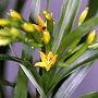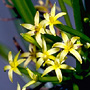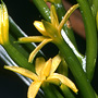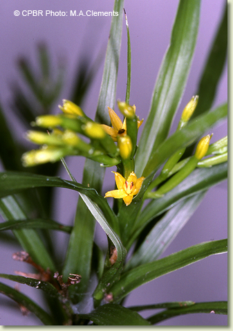 Terrestrial evergreen herb forming grass-like clumps. Roots wiry, much branched, with variously sized fleshy tubercules. Stems single or multiple, erect, 10-25 cm long, tough, fibrous, wiry. Leaves scattered along stem, erect to pendulous, whorled, sessile, bases sheathing stem, lamina subulate, 10-20 cm x 0.7-1 cm wide, dark green, thin-textured, leathery, apex filiform. Inflorescence axillary, racemose or sparsely paniculate, arching to pendulous, 50-100 mm long, wiry; ovaries erect, slender. Flowers 5-40, non-resupinate, erect, star-shaped, 8-10 mm wide, yellow. Perianth segments and labellum similar in size and form; narrowly triangular, 4-6 mm long, 1-1.5 mm wide, distal margins involute, apex cymbiform; sepals and petals with exterior keeled midrib. Callus absent. Column porrect, 3 mm long, not fused for entire length; filaments and stigma free at distal end. Column foot absent. Pollinia absent. Capsules erect, indehisent, disintegrating when ripe.