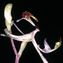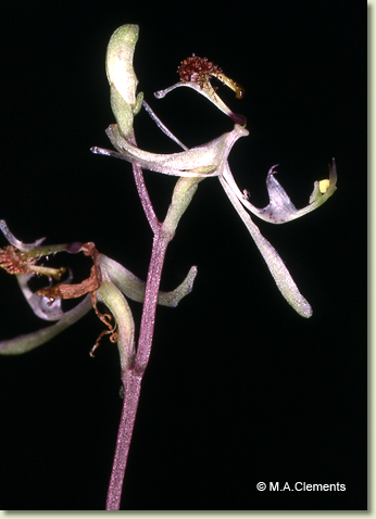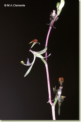 Terrestrial tuberous herb forming spreading colonies. Sterile and flowering plants dimorphic.Sterile plants a basal rosette of leaves only. Fertile plants an inflorescence with a rosette arising later from lateral stem at base of peduncle. Leaves 2-3, prostrate, ground-hugging, basal; lamina narrowly ovate to narrowly lanceolate, 2-25 mm x 3-7 mm, dull bluish green above, shiny beneath, apex acute to acuminate. Inflorescence a terminal raceme, erect, 150-300 mm tall, slender, green; pedicels obliquely erect, c. 2 mm long. Flowers 3-12, non-resupinate, erect to porrect, 9-14 mm long, pale green with shiny yellow labellum glands. Dorsal sepal free, decurved, linear-obovate when flattened, 8-10 mm x 2.4 mm base embracing proximal third of column, conduplicate in distal half, apex obtuse. Lateral sepals reflexed against the ovary, oblong, falcate, 5-6.5 mm x 2 mm, distal margins conduplicate, apex obtuse. Petals reflexed against the ovary, linear, falcate, 6-7 mm x 1 mm, apex obtuse to subacute. Labellum free, recurved, 5.5 mm x 0.8 mm, hinged to underside of column foot by claw 0.1 mm long, base dark purple, 1.4 mm wide, becoming pale green along the lamina, apex obtuse. Callus insectiform, proximally fused to lamina, 4 mm long; central area with crowded shiny clubbed calli 0.6-1 mm long; apex broadly emarginate, 1.6 mm wide, with shiny black glands. Column incurved in a semi-circle, 7 mm long, inner surface shortly pubescent, with 2 pairs of column wings; proximal column wings projecting forwards, triangular, 3 mm x 3 mm; distal wings smaller, narrowly triangular, 2 mm x 0.4 mm, divergent above anther. Column foot 2 mm long, apex anvil-shaped. Capsules not seen.