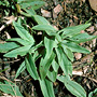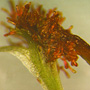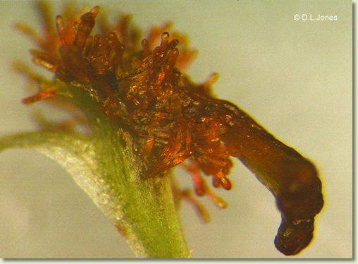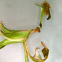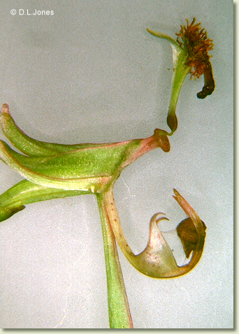 Terrestrial tuberous herb forming spreading colonies. Sterile and flowering plants dimorphic.Sterile plants a basal rosette of leaves only. Fertile plants an inflorescence with a rosette arising later from lateral stem at base of peduncle. Leaves 3-5, prostrate, ground-hugging, basal; lamina narrowly lanceolate, 3-8 cm x 0.8-1.4 cm, bluish green. Inflorescence a terminal raceme, erect, 120-350 mm long. Flowers 5-30, non-resupinate, erect to porrect, 10-14 mm long, light greenish or reddish with reddish or purplish labellum glands. Dorsal sepal free, decurved, 8-11 mm x 2 mm, base embracing proximal third of column, conduplicate in distal half, apex obtuse. Lateral sepals reflexed against the ovary, oblong, falcate, 5-7 mm x 1-1.5 mm, distal margins conduplicate, apex obtuse. Petals reflexed against the ovary, linear, 5-7 mm x 1 mm. Labellum free, 5 mm x 1 mm, hinged to underside of column foot by claw, base reddish, 1.5 mm wide. Callus insectiform, proximally fused to lamina, 2.5 mm long; central area with crowded, clubbed calli, 0.5-1.5 mm long, reddish or purplish; apex 1 mm wide, emarginate, with shiny blackish glands. Column incurved in a semi-circle, with 2 pairs of column wings; proximal column wings projecting forwards, triangular; distal wings smaller, narrowly triangular, divergent above anther. Column foot 4 mm long. Capsules not seen.