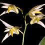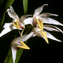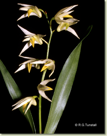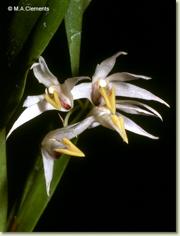 Epiphytic or lithophytic orchid forming spreading strands or tangled masses. Rhizome creeping, appressed to host, branched, 2.5-4 mm wide. Pseudobulbs widely spaced, ovoid to conical, short, 2-3.5 cm x 10-15 mm, yellowish green, hard, furrowed, sheathed in papery bracts when young. Leaves 1-2 per pseudobulb, erect, apical, sessile; lamina linear to narrowly oblong, 5-10 cm x 0.7-1 cm wide, dark green, thin-textured, leathery, sometimes twisted along length, apex unequally emarginate. Inflorescence a terminal raceme, erect to arching, 30-80 mm long, thin: pedicels 5-9 mm long. Flowers 5-10, resupinate, porrect, star-shaped, 8-10 mm wide, white or cream with orange or yellow labellum. Sepals and petals narrowly to widely spreading, narrowly triangular, apices acuminate. Dorsal sepal free, obliquely erect, 10-14 mm x 1.5 mm. Lateral sepals divergent, falcate, 12-14 mm x 2 mm, bases fused to column foot. Petals free, porrect, 10-14 mm x 1.5 mm. Labellum curved, elliptic, 14 mm x 6 mm, with 3 lobes; lateral lobes short, incurved; midlobe thick, noticeably longer than lateral lobes, orange with darker markings, with 3 slender ridges, apex acute. Column more or less straight, 2 mm long. Column foot curved, 3-4 mm long, at slight angle to column. Capsules pendulous, dehiscent.