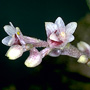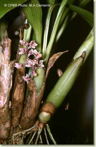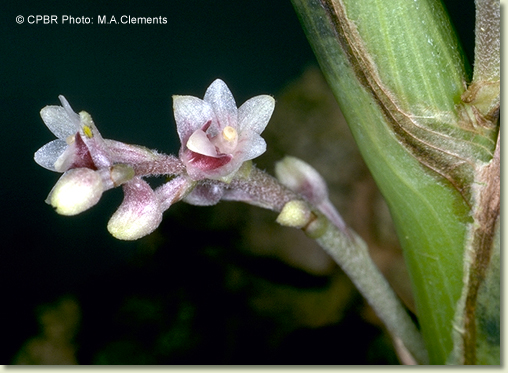 Epiphytic or lithophytic herb forming large, open clumps. Rhizomes creeping, well-developed, branched. Pseudobulbs widely spaced, erect, cylindrical, 6-10 cm x 1-1.4 cm, green, fleshy, covered by white papery bracts when young. Leaves 2 per pseudobulb, erect, apical, on petioles 2-3 cm long; lamina lanceolate to elliptic, 15-20 cm x 2-3 cm wide, bright green, thin-textured, apex unequally emarginate. Inflorescence an axiliary raceme, erect to arching, 30-50 mm long, pubescent throughout; pedicels 5 mm long. Flowers 3-12, resupinate, erect to porrect, remaining closed or cupped, 4 mm x 3 mm, white to purplish mauve. Sepals externally pubescent. Dorsal sepal free, erect to recurved, obovate, 3 mm x 2 mm, apex obtuse. Lateral sepals broadly triangular, falcate, 3 mm x 2.5 mm, bases fused to column foot, apex obtuse to apiculate. Petals free, obovate, 3 mm x 1.5 mm. Labellum curved, 4 mm x 3.5 mm, mauve with white tip, 3-lobed; lateral lobes erect; midlobe triangular, recurved, with 2 broad widely separated ridges. Column 1.5 mm long. Column foot 1.5-2.5 mm long, more or less in line with column. Capsules erect, dehiscent.