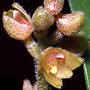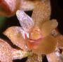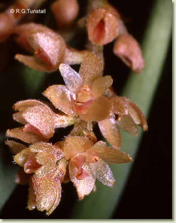 Epiphytic or lithophytic herb forming dense clumps. Rhizomes creeping, branched. Pseudobulbs crowded, erect, cylindrical, 4-6 cm x 0.8-1.2 cm, fleshy, green. Leaves 2 per pseudobulb, erect, apical, on short petioles; lamina ovate to lanceolate, 6-12 cm x 1.6-2 cm, dark green, thick, apex unequally emarginate. Inflorescence an axiliary raceme, arching, short, 20-40 mm long, covered in fine hairs, pedicels 3 mm long. Flowers 3-12, resupinate, porrect, opening tardily or cup-shaped, 3 mm wide, cream or pinkish, externally hairy. Dorsal sepal ovate, incurved, 3 mm x 1.4 mm. Lateral sepals free, incurved, triangular, falcate, 3 mm x 2 mm. Petals obliquely erect, ovate to obovate, 2.5 mm x 1 mm, apex acute. Labellum 2 mm x 1.5 mm, curved, 3-lobed; lateral lobes erect; midlobe triangular, deflexed, with 2 short ridges at base of lateral lobes. Column 0.5 mm long. Column foot, 0.7 mm long, at right-angles to column. Capsules erect or porrect, dehiscent.