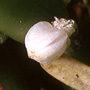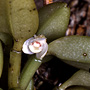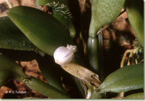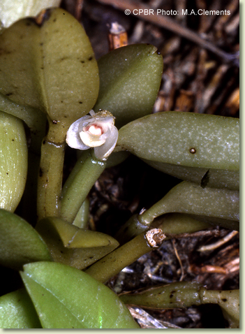 Epiphytic or lithophytic herb forming small tufted clumps. Stems unbranched, erect or curved, forming a tuft, cylindrical, 1-1.8 cm x 2-2.5 mm, slender. Leaf solitary on stem, erect, apical, shortly petiolate; lamina ovate to lanceolate, 1.5-3 cm x 0.7-1 cm, dark green, fleshy, apex emarginate. Inflorescence single-flowered, from meristem at leaf base; pedicel 3 mm long. Flowers solitary, resupinate, erect to porrect, opening narrowly, 6-8 mm wide, white, produced in sporadic bursts; ovary conspicuously covered with fleshy hair-like tubercles. Sepals similar in shape and size, much broader than petals. Dorsal sepal free, broadly ovate, 3 mm x 2.5 mm, apex obtuse. Lateral sepals broadly ovate, 3 mm x 2.5 mm, bases fused to column foot, apex obtuse. Petals linear, falcate, 3 mm x 0.5 mm. Labellum oblong, 4 mm x 2 mm, obscurely 3-lobed; lateral lobes small; midlobe hairless; spur c. 1.5 mm long, nearly globular. Column erect, 1.5-2 mm long; column wings forming 2 apical teeth, extending above anther. Column foot 1.5-2 mm long, in line with column. Capsules obovoid, 0.5-1 mm long, covered in small fleshy hair-like tubercules, dehiscent.