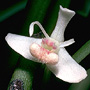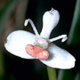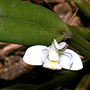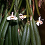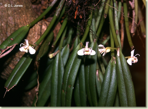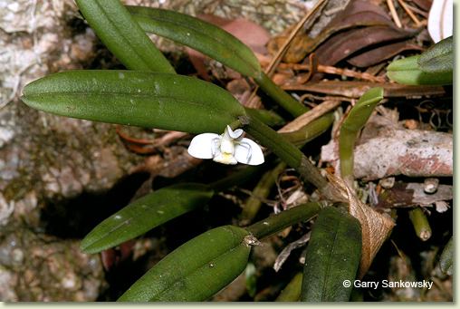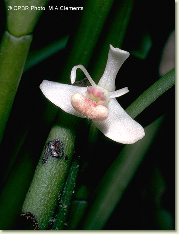 Epiphytic or lithophytic herb forming small dense clumps. Stems unbranched, erect, forming a tuft, cylindrical, 4-10 cm x 0.4-0.5 cm wide, shallowly grooved, base sheathed in papery bract when young. Leaf solitary on stem, erect, apical, oblong, 3-5 cm x 0.8-12 cm, dark green, leathery, apex emarginate. Inflorescence single-flowered, from meristem at leaf base; pedicel 10-20 mm long, enclosed by papery bract, 4-8 mm long; ovary smooth. Flowers 1-2, produced in sporadic bursts, resupinate, porrect to erect, opening widely, 10-12 mm wide, white with yellow or pink labellum. Sepals and petals widely spreading, sepals broader than petals. Dorsal sepal erect, oblong, 6 mm x 2 mm, incurved toward apex. Lateral sepals broadly oblong to broadly ovate, 6 mm x 4.5 mm, bases fused to column foot. Petals obliquely erect, very narrow, linear, 6 mm x 0.5 mm, incurved in distal third. Labellum 8 x 5 mm, 3-lobed; lateral lobes oblong; midlobe strongly recurved, fleshy, densely hairy. Column 4 mm long. Column foot 3 mm long. Capsules smooth, dehiscent.