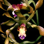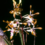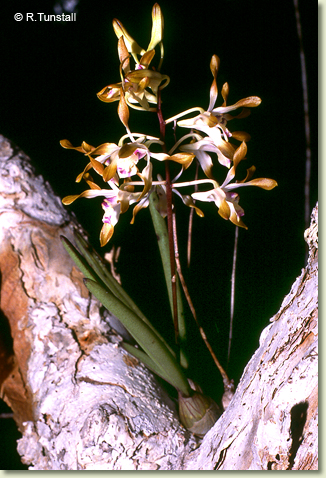 Epiphytic or lithophytic herb forming small to medium-sized clumps. Rhizome superficial, branched. Pseudobulbs erect, conical to fusiform, 3-12 cm x 1-3 cm, yellowish. Leaves 2-6 per pseudobulb, erect, apical, sessile; lamina terete, 10-25 cm x 0.6-1.2 cm, dark green, deeply channelled, fleshy, apex acute to acuminate. Inflorescence an axillary raceme, erect to arching, 200-300 mm long from apical nodes; pedicels 12-25 mm long. Flowers 5-30, resupinate, porrect, star-shaped, 20-25 mm x 25-30 mm, light brown to caramel with darker tips, centre sometimes whitish. Sepals and petals opening widely, twisted near apiculate apex. Dorsal sepal free, oblong to narrowly triangular, 10-15 mm x 3-4 mm, apex obtuse to acuminate. Lateral sepals similar to dorsal sepal, 10-15 mm x 3-4 mm, bases fused to column foot. Petals erect, spathulate, longer and slightly narrower than sepals, 13-18 mm x 2.5-3 mm, apex obtuse to acuminate. Labellum 10-13 mm x 7-9 mm, white with purple streaks; lateral lobes broad, erect; midlobe 4-5 mm wide, shortly pointed with 3 undulate ridges. Column 3-4 mm long. Column foot 4-5 mm long. Capsules pendulous, dehiscent.