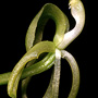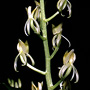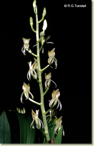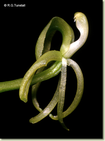 Epiphytic or lithophytic herb forming medium-sized to large dense clumps. Rhizome superficial. Pseudobulbs crowded, erect, ovoid to obovoid, laterally compressed and imbricate, 4-7 cm x 2.5-4 cm, dark green to yellowish green, fleshy, when young covered with 2 short leaf-like bracts. Leaves 2-4 per pseudobulb, erect, apical, sessile; lamina linear to lanceolate, 12-30 cm x 2-3 cm, thin-textured, dark green to yellow-green, apex acute to acuminate. Inflorescence a terminal raceme, erect to arching, 150-250 mm long; pedicels 5-15 mm long, including ovary. Flowers 8-20, resupinate, erect to porrect, star-shaped, 13-17 mm x 8-11 mm, greenish or pale yellow. Sepals and petals narrow, strongly reflexed, sometimes curled. Dorsal sepal free, linear, 8-12 mm x 1.5-2 mm. Lateral sepals free, linear, 8-12 mm x 1.5-2 mm. Petals linear, narrow, 8-12 mm x 1 mm. Labellum unlobed, broader than sepals and petals, strongly recurved from middle, rhomboidal when flattened, 13-16 mm x 7-9 mm, base channelled, with 2 flat orange bands, apex cut off square with small central point. Column incurved, 6-7 mm long, widest at base. Column foot absent. Capsules erect, dehiscent.