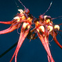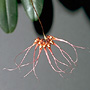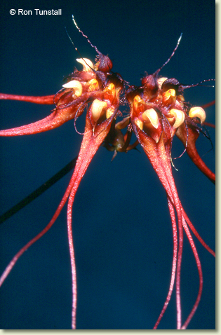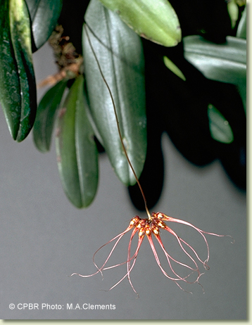 Epiphytic herb forming small to medium-sized moderately dense clumps. Rhizomes creeping, appressed to host, branched, slender, 2 mm thick. Pseudobulbs widely spaced, erect, ovoid, 1-1.8 cm x 1-1.5 cm, dark olive green, with 4-5 prominent ridges. Leaf solitary on pseudobulb, erect, apical, shortly petiolate; lamina oblong to narrowly ovate, 5-8 cm x 3-3.5 cm, dark olive green, thick, leathery, apex emarginate. Inflorescence an axillary umbel, erect to arching, 150-250 mm long, wiry, from base of pseudobulb. Flowers 6-10, resupinate, porrect, in semi-circular umbel, each flower 30-50 mm x 5-8 mm, purplish red with a white or cream labellum. Dorsal sepal porrect, hooded, ovate, 3 x 2 mm, apex with erect filiform cilium 5-6 mm long, margins hairy. Lateral sepals deflexed, twisted, 'outer' margins fused near base to form a short synsepalum, 7-8 mm x 3-4 mm, bases fused to column foot; apices drawn into filiform tails 18-25 mm long. Petals drooping, triangular, 5-6 mm x 1 mm, hairy. Labellum unlobed, hinged to the apex of the column foot, porrect to decurved, 1.6-2 mm x 1 mm, fleshy, curved, grooved towards the base. Column at an angle to the ovary, 2 mm x 1 mm. Column foot at right-angles to the column, 2 mm long, apex uncinate. Capsules erect, dehiscent.