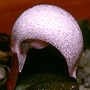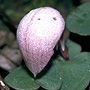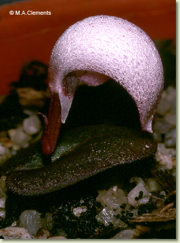 Terrestrial herb forming small colonies. Tubers 2, globose, fleshy. Leaf solitary, prostrate, ground-hugging, basal, lamina cordate, 2-3 cm x 2-3 cm, dark green or reddish green above, silvery green or reddish beneath. Inflorescence terminal, single-flowered, sessile. Flower solitary, resupinate, leaning forwards, 3-3.5 mm x 15-20 mm, sparkling white or pinkish. Dorsal sepal free, curved, strongly hooded, 27-32 mm x 15-20 mm, much longer than labellum. Lateral sepals much reduced, linear, 2 mm long. Petals minute, linear, 1 mm long. Labellum unlobed, white, mostly hidden by dorsal sepal, margins sharply recurved, densely covered with bristles. Column 4 mm long. Column foot absent. Capsules erect, dehiscent.