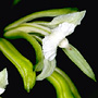 Terrestrial herb forming spreading clumps. Rhizomes slender, 3 mm wide. Stems erect, unbranched, 50-150 cm tall, thin, wiry. Leaves 6-15 per stem, scattered along stem, erect to prostrate, alternate, sessile, bases sheathing stem; lamina ovate to obovate, 20-30 cm x 7-10 cm, dark green, thin-textured, prominently pleated, margins entire to undulate, apex acute to acuminate. Inflorescence an axillary panicle, corymbose, from upper axils, peduncle very short. Flowers 20-60, crowded, short-lived, non-resupinate, porrect, 20-25 mm wide, sepals green, petals and labellum white. Dorsal sepal free, deflexed, lanceolate, 25-30 mm x 2-3 mm. Lateral sepals free, spreading or incurved, linear to lanceolate, falcate, 20-25 mm x 2-3 mm. Petals recurved or curled, lanceolate, 25-30 mm x 3-4 mm, margins undulate or crisped. Labellum unlobed, 20-25 mm x 8-12 mm; base narrow, tubular, embracing column; apical part expanded, cordate, margins crenate. Column straight, 9-15 mm long. Column foot absent. Capsules porrect, dehiscent.