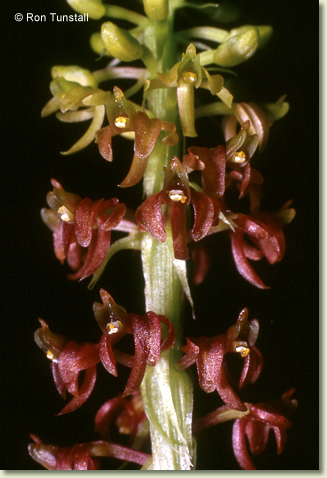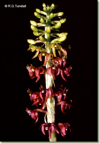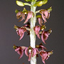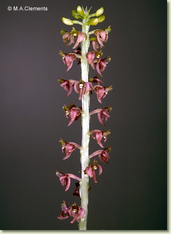 Terrestrial herb. Rhizome absent. Stems conical, erect, 10-20 cm x 1-2 cm, fleshy, lasting 2 years. Leaves 3-6, scattered along upper half of stem, erect to prostrate, usually sessile, bases sheathing stem; lamina ovate to elliptic, 10-30 cm x 5-9 cm, thin-textured, pleated, veins prominent, bright green, margins undulate, apex acute to acuminate. Inflorescence a terminal raceme, 15-30 cm tall, wiry, brittle; pedicels including ovary 2-4 mm long, filiform. Flowers numerous, crowded, non-resupinate, porrect, 5-6 mm x 5-6 mm, greenish, brown, reddish or purplish. Sepals and petals shallowly grooved, narrow. Dorsal sepal incurved, linear, 3.5-4 mm x 1-1.2 mm. Lateral sepals incurved over labellum, oblong to ovate, falcate, 3-3.5 mm x 1.3-1.5 mm. Petals linear, falcate, 3.5-4 mm x 0.8 mm, incurved between sepals. Labellum rectangular, 2.2-2.5 mm x 2 mm, with 3 blunt apical teeth, central tooth longest and upcurved; base deeply pouched. Column slender, 1.7 mm long. Column foot absent. Capsules erect, dehiscent.