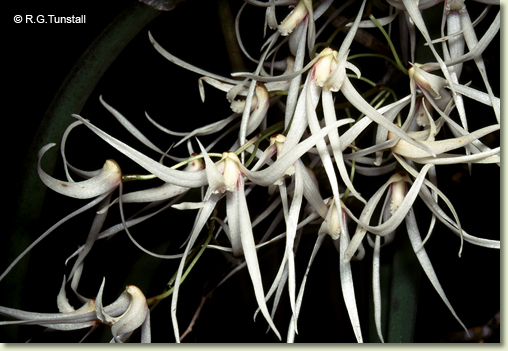 Epiphytic or lithophytic herb forming small semi-pendulous clumps. Stems semi-erect to pendulous, sparsely branched, 0.4 cm thick, yellowish, hard. Leaf terminal on stem, erect to pendulous, sessile; lamina terete or subterete, 10-15 cm x 0.8-0.9 cm, dark green, fleshy, grooved, apex obtuse, often curved. Inflorescence an axillary raceme, 4-7 cm long, from node near leaf base; pedicels 8-15 mm long. Flowers 6-12, non-resupinate, porrect to nodding, star-shaped, 20 mm x 25 mm, white, cream or pinkish with a few purple markings. Sepals and petals remaining partly closed or spreading widely, very narrow, apices acuminate. Dorsal sepal obliquely erect, narrowly triangular, 25-28 mm x 3 mm. Lateral sepals narrowly triangular, 25-28 mm x 3 mm, bases fused to column foot. Petals linear, 25-28 mm x 1.5 mm. Labellum curved, 18 mm x 4 mm, 3-lobed; lateral lobes triangular, with purple stripes; midlobe recurved, apex filiform. Column 2-3 mm long. Column foot 3-4 mm long, at right-angles to column. Capsules porrect to pendulous, dehiscent.