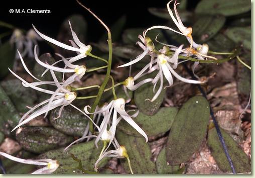Epiphytic or lithophytic herb forming spreading mats. Stems creeping, appressed to host, much-branched, 0.3-0.4 cm thick, becoming yellowish, tough. Leaf terminal on stem, prostrate, sessile; lamina oblong to obovate, 2-4 cm x 1.2-1.5 cm, dark green, thick, fleshy, smooth, upper surface longitudinally furrowed, apex obtuse. Inflorescence an axillary raceme, erect, 60-150 mm long, from node near leaf base; pedicels 10 mm long, filiform. Flowers 6-20, non-resupinate, porrect to nodding, star-shaped, 7-9 mm x 8-13 mm, white with yellow callus. Sepals and petals not spreading widely, narrowly triangular, thin-textured. Dorsal sepal obliquely erect, 18-22 mm x 3-4 mm, apex acuminate. Lateral sepals divergent, falcate, 18-22 mm x 4-5 mm, bases fused to column foot, apex acuminate. Petals obliquely erect, 16-20 mm x 2 mm, apex acuminate. Labellum curved, 5-6 mm x 4 mm, apex often curled, 3-lobed; lateral lobes small, obtuse; midlobe margins undulate, apex acuminate; upper surface with 3 undulate ridges. Column 2-3 mm long. Column foot 3-4 mm long, curved. Capsules porrect to pendulous, dehiscent.