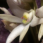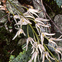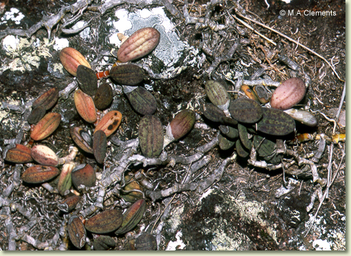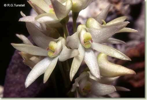 Epiphytic or lithophytic herb forming spreading mats. Stems creeping, appressed to host, much-branched, 0.4 cm thick, becoming yellowish. Leaf terminal on stem, prostrate, sessile; lamina oblong to orbicular, 3-4.5 cm x 1.5-2 cm, dark green, thick, fleshy, furrowed, sandpapery. Inflorescence an axillary raceme, erect, 60-150 mm long, from node near leaf base, the flowers often on one side; pedicels 10 mm long, filiform. Flowers 6-15, non-resupinate, porrect to nodding, star-shaped, 6-8 mm x 6-9 mm, cream, quickly ageing yellowish, bronze or brownish. Sepals and petals not spreading widely, narrow, apices obtuse, thin-textured. Dorsal sepal narrowly triangular, 12-16 mm x 3-4 mm. Lateral sepals divergent, narrowly triangular, falcate, 12-16 mm x 4-5 mm, bases fused to column foot. Petals linear, 12-14 mm x 2 mm. Labellum 4.5 mm x 3 mm, curved, 3-lobed; lateral lobes small, obtuse; midlobe margins undulate, apex apiculate; upper surface with 3 widely separated ridges. Column 2-3 mm long. Column foot 3-4 mm long, curved. Capsules porrect to pendulous, dehiscent.