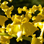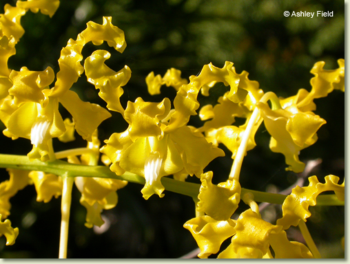 Epiphytic or lithophytic herb forming large clumps. Pseudobulbs erect to arching, elongate, cylindrical, slightly thicker in middle, 100-500 cm x 4-6 cm, green, becoming yellowish, sometimes striped, hard, covered in papery bracts when young. Leaves 10-35, scattered along upper two-thirds of stem, erect to prostrate, distichous, sessile, bases sheathing stem; lamina ovate, 8-16 cm x 3.5-5 cm, dark green to yellowish, often concave, leathery, apex emarginate. Inflorescence an axillary raceme, erect to arching, 200-600 mm long. Flowers 10-40, resupinate, porrect, opening sequentially, star-shaped, 40-80 mm x 40-80 mm, greenish yellow, bright golden-yellow or canary-yellow with varnished lustre and prominent white labellum callus. Sepals and petals widely spreading, strongly twisted, with undulate margins. Dorsal sepal recurved, narrowly oblong, 25-35 mm x 5-7 mm. Lateral sepals widely divergent, narrowly oblong to narrowly triangular, 25-35 mm x 5-7 mm bases fused to column foot. Petals obliquely erect, narrowly oblong to narrowly obovate, 35-40 mm x 7-8 mm. Labellum 17-24 mm x 11-15 mm, 3-lobed; lateral lobes, large, outcurved; midlobe decurved, 5-7 mm x 2-4 mm, with 3 main ridges, sometimes also accessory ridges, margins undulate. Column 3-6 mm. Column foot 5-12 mm. Capsules porrect to pendulous, dehiscent.