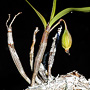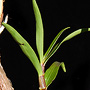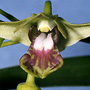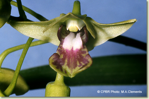 Epiphytic or lithophytic herb forming small clumps. Pseudobulbs erect, cylindrical or middle slightly swollen, 5-25 cm x 0.6-1 cm, dark purplish brown, hard, covered in papery bracts when young, becoming furrowed with age. Leaves 2-5, erect, apical, distichous, sessile, bases sheathing pseudobulb; lamina narrowly ovate, 5-10 cm x 1.5-2 cm, dark green, apex unequally acuminate. Inflorescence an axillary raceme, erect to arching, 40-80 mm long, from upper nodes of pseudobulb; pedicels 10-20 mm long. Flowers 2-7, resupinate, porrect, star-shaped, 15-20 mm x 20-25 mm, pale green or yellowish with deep purple labellum. Sepals and petals widely spreading, moderately thick-textured. Dorsal sepal projecting forwards, ovate, 6-10 mm x 5 mm, apex acute. Lateral sepals widely divergent, triangular, 8-12 mm x 5 mm, bases fused to column foot, apex acute. Petals narrowly ovate, 5-8 mm x 3 mm, apex acute to acuminate. Labellum curved, 10 mm x 7 mm, 3-lobed; lateral lobes large, erect, triangular; midlobe broad, with 2 parallel ridges, margins erect, flanking column, apex deeply emarginate. Column 3 mm long. Column foot curved, 7-8 mm long. Capsules pendulous, dehiscent.