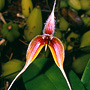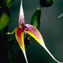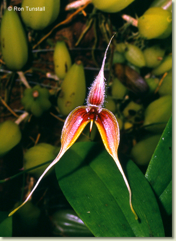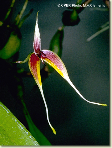Epiphytic herb forming moderately dense, medium-sized clumps. Rhizomes creeping, appressed to host, much-branched, slender, 2 mm thick. Pseudobulbs widely spaced, erect, conical, tapered, 1.5-4 cm x 0.8-1.2 cm, dark green to yellowish green, grooved. Leaf solitary on pseudobulb, erect, apical, petioles 1-2 cm long, bases not sheathing stem; lamina elliptic to lanceolate, 8-15 cm x 1.5-2.5 cm, dark green to yellowish green, thin-textured but stiff, apex unequally emarginate. Inflorescence axillary, single-flowered, erect, 100-200 mm long, from rhizome nodes, thin; pedicels 20-25 mm long, including ovary. Flower solitary, resupinate, porrect, 6-9 cm x 2-2.5 cm, reddish to reddish purple, with yellow or white margins and white tips on the sepals; petals purplish. Dorsal sepal erect, oblong-lanceolate, 20-35 mm x 3-4 mm, margins densely ciliate, apex aristate. Lateral sepals deflexed to pendulous, fused at the base, each sepal asymmetric, ovate-lanceolate, 35-80 mm x 5-7 mm, bases fused to column foot, apices tapering, with clubbed filiform tails, 20-30 mm long, often tangled. Petals falcate, forming a hood over the column and labellum base, 4-7 mm x 2 mm, margins finely denticulate. Labellum unlobed, hinged on the apex of the column foot, 5-7 mm x 1.5-2 mm, purple and yellow; apex drawn out into a thin linear appendage. Column porrect from the end of the ovary, 3 mm long, with long apical wings. Column foot at right-angles to the column, 1.5 mm long, uncinate. Capsules unknown.