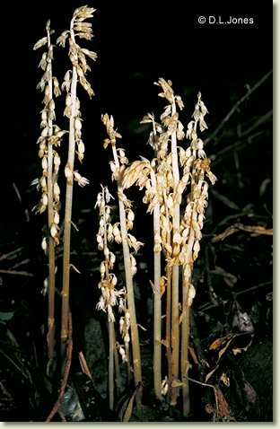 Occurs in high rainfall areas, particularly rainforests but also open forests, woodlands and grasslands, and occasionally in gardens. The plants are pale and unable to photosynthesise, relying instead on a beneficial association with mycorrhizal fungi that live in the decaying wood where they grow. They occur in small groups, surviving there only as long as the host wood is in a suitable stage of decay. The plants are above ground for 1-2 weeks, appearing after the first soaking rains in the wet season and taking only a few days from flowering to seed dispersal.