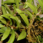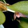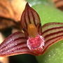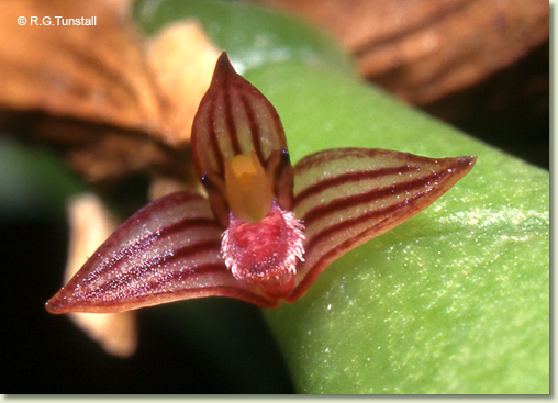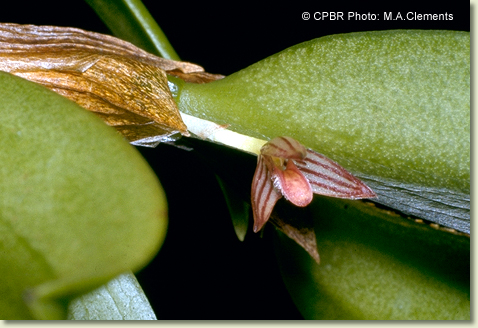 Epiphytic or lithophytic herb forming pendulous clumps. Stems few to many, pendulous, 10-40 cm x 0.4 cm, rooting at the base, clothed in brown bracts, apex upcurved. Pseudobulbs appressed to the stem, more or less alternate, cylindrical, 1-1.5 cm x 0.2-0.3 cm wide, partially hidden by bracts. Leaf terminal on pseudobulb, erect to pendulous, apical, sessile, base not sheathing pseudobulb; lamina ovate to elliptic, 4-8 cm x 1-1.8 cm, often curved, thin-textured but tough, sometimes fleshy, shallowly channelled, apex unequally emarginate, often decurved. Inflorescence an axillary raceme, single-flowered, 6-10 mm long, from pseudobulb base; pedicels filiform. Flower solitary, resupinate, porrect to semi-nodding, 3-4 mm x 4-5 mm, pink, cream or yellow with red or purple stripes (rarely unstriped) and a red and yellow labellum. Perianth segments not spreading widely. Dorsal sepal porrect, hooded, ovate, 4-5 mm x 1.5-2 mm, apex acuminate. Lateral sepals broadly triangular, 4-5 mm x 2-2.5 mm, bases fused to column foot, apex acuminate. Petals porrect to incurved, ovate to oblong, 2 mm x 1 mm. Labellum hinged on the apex of the column foot, oblong to obovate, 3 mm x 1 mm, fleshy, channelled, curved, 3-lobed; undersurface covered with numerous fine wavy hairs. Column porrect from end of ovary, 1 mm long. Column foot at right-angles to the column, 2 mm long, apex incurved. Capsules erect, dehiscent.