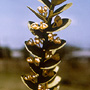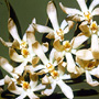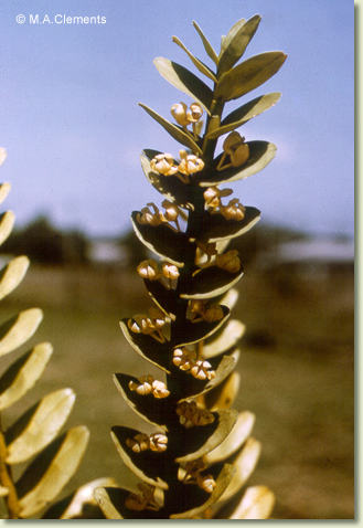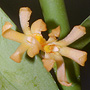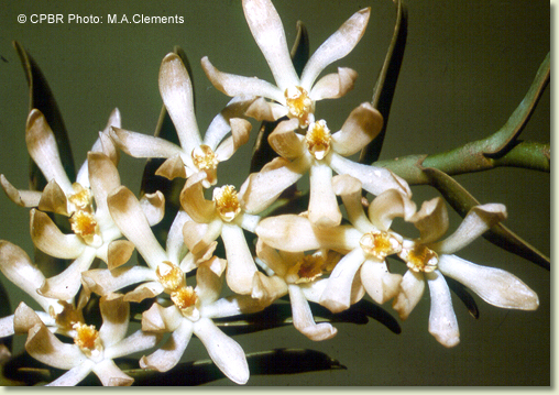 Epiphytic or lithophytic herb forming large, straggling clumps. Stems erect to pendulous, flattened, 30-200 cm x 1-1.5 cm, yellowish. Leaves scattered along stem, erect to pendulous, distichous, sessile, bases sheathing stem and covering node; lamina ovate, 8-12 cm long, 4-4.5 cm wide, yellowish green, leathery, apex unequally emarginate. Inflorescence an axillary raceme, emerging opposite a leaf; pedicels 9-12 mm long, including ovary. Flowers 1-2, in pairs, resupinate, porrect to nodding, star-shaped, 17-20 mm x 17-20 mm, cream, dull yellow or greenish. Sepals and petals usually incurved, sometimes spreading for a few hours. Dorsal sepal linear, 20-25 mm x 6 mm. Lateral sepals linear, 14-18 mm x 5 mm. Petals linear, 13-17 mm x 5 mm. Labellum curved near the middle, 9 mm x 8 mm, bright yellow, banded inside, 3-lobed; lateral lobes rounded, glandular inside; midlobe triangular, with broad ridge and prominent central patch of yellow hairs. Column 4 mm long. Column foot straight, 3 mm long, at an obtuse angle to column. Capsules pendulous, dehiscent.